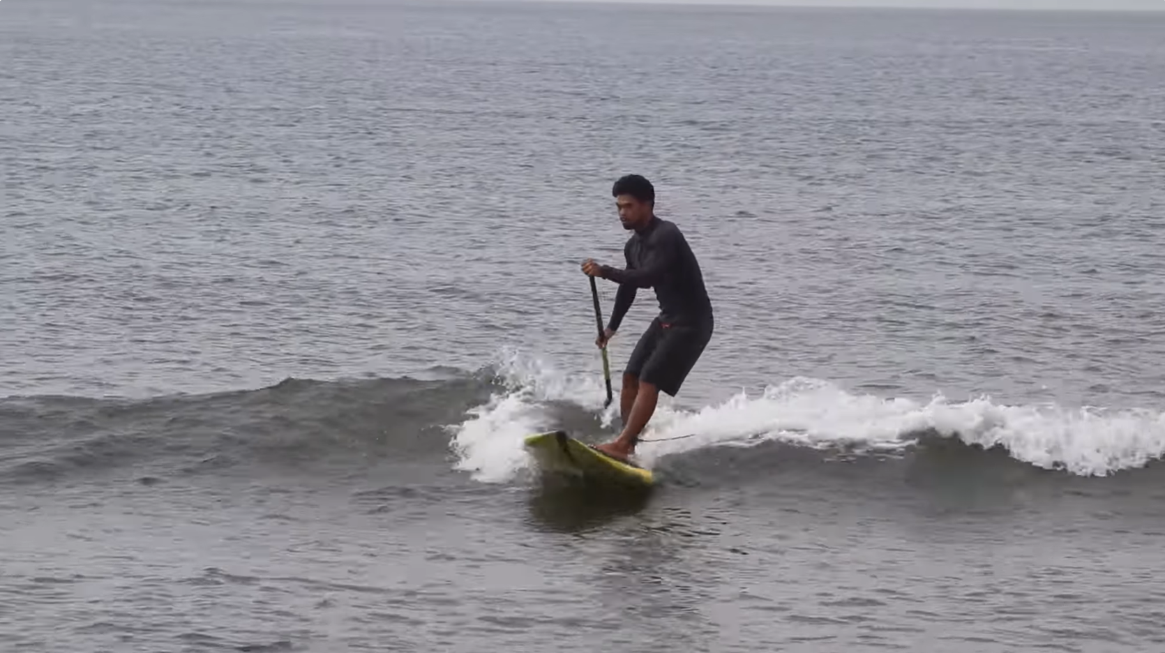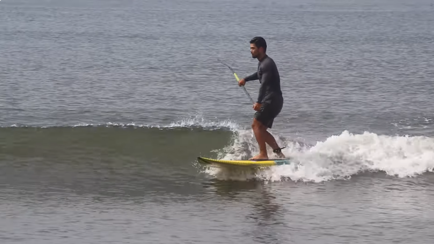このように、目線とパドルを連動させることが、長く波に乗るためのSUPサーフィンのコツです。